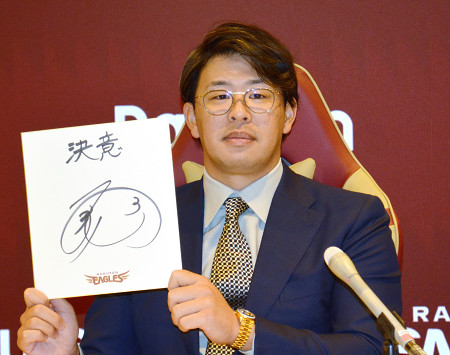 来季が4年契約の最終年となる35歳の浅村が現状維持の5億円で更改した(金額は推定)=21日、仙台市 【時事通信社】