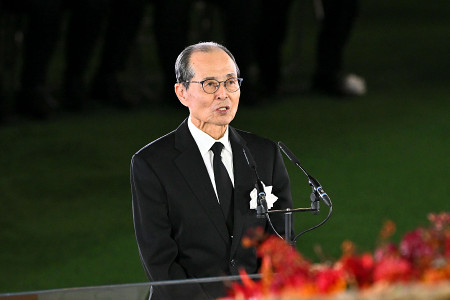プロ野球巨人の選手、監督として活躍し、6月に89歳で死去した長嶋茂雄さんのお別れの会が21日、東京ドームで営まれた。写真は、お別れの言葉を述べる王貞治氏。 【時事通信社】