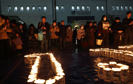 阪神大震災の発生から31年を迎え、発生時刻から12時間後の午後5時46分に合わせ黙とうする人たち=17日午後、神戸市長田区 【時事通信社】