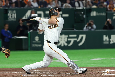 巨人が逆転勝ち。1点を追う7回、増田陸と岸田が安打で出塁し、代打の大城(写真)が3ランを放った。井上が7回1失点で今季初勝利。マルティネスが今季初セーブを挙げた=5日、東京ドーム 【時事通信社】