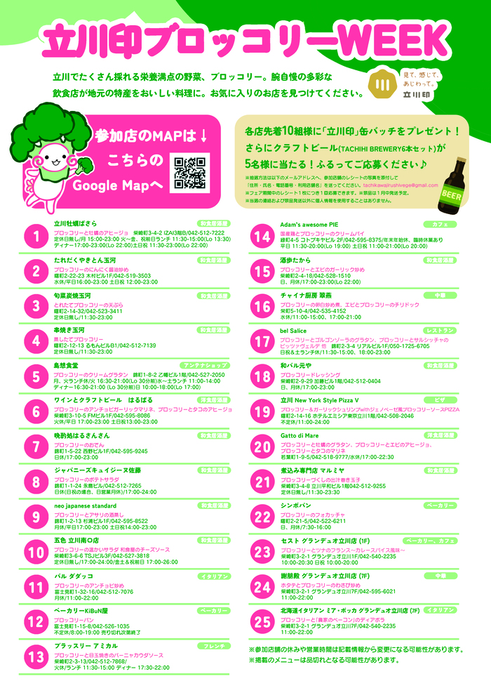 立川産ブロッコリーを使った限定メニューを提供するイベント「立川印ブロッコリーWEEK2025」が11月20日から、立川市内の飲食店で始まる。