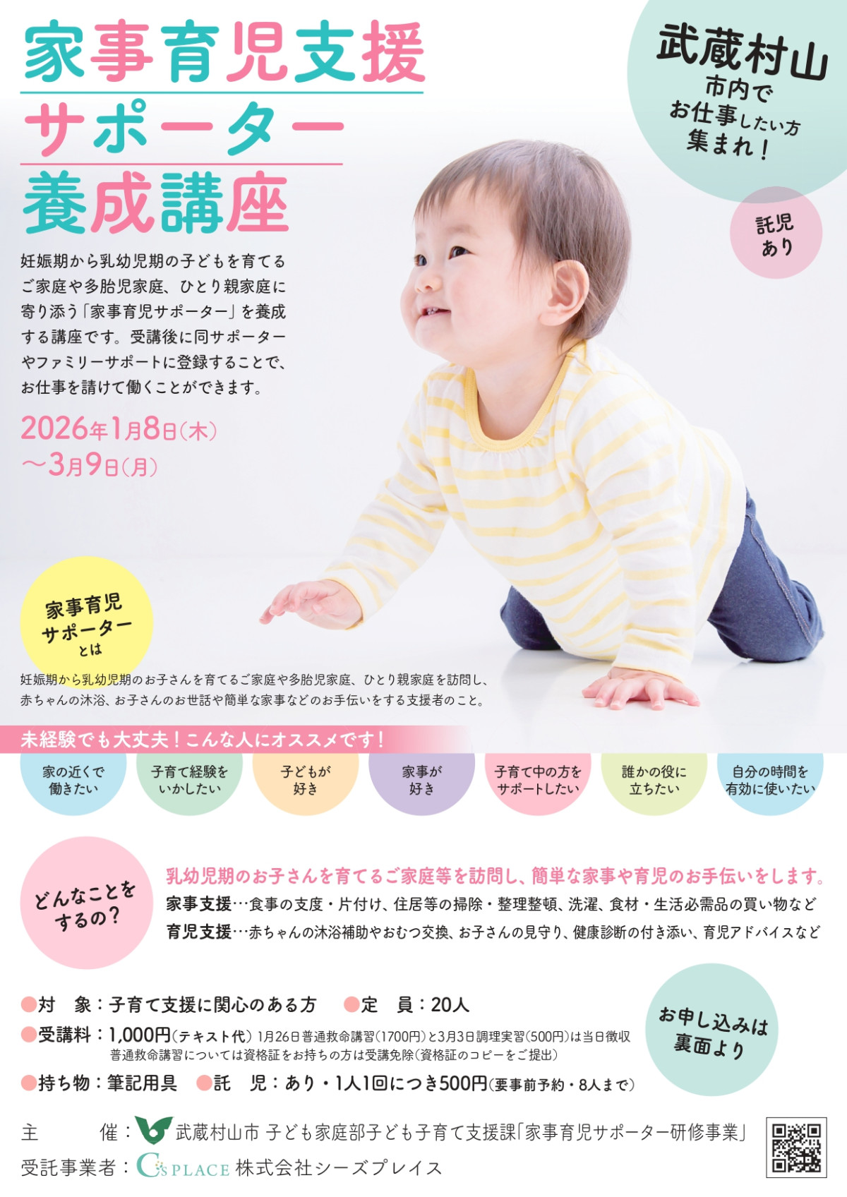 武蔵村山市が1月8日から、乳幼児を育児中の家庭のための「家事育児支援サポーター養成講座」を開く。