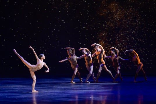 続く演目は世界各国の名門バレエ学校の生徒たちによる作品が並びます。熊川哲也、吉田都を輩出し、日本でも高い人気を誇るロイヤル・バレエ・スクールはアシュトンの名作『ラプソディ』よりパ・ド・ドゥを披露し、英国バレエの気品と高度な技術で、洗練された美しさを一層際立たせました。プリンセス・グレース・アカデミーによる『セレスティアル・ダスト』は、今年6月に大阪・関西万博「モナコ・ナショナルデー」で上演された話題作。穏やかなピアノの旋律にのせ、6名の生徒たちがすらりと伸びる手足で繊細な流れを絶え間なく紡ぎ出し、幻想的な世界で観客を魅了しました。