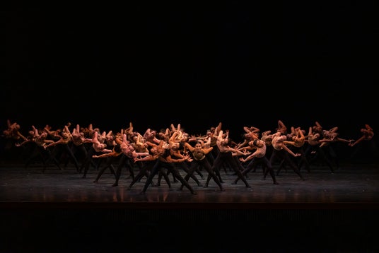 公演の最後を飾ったのは、気鋭の振付家シャハール・ビンヤミニによる『ボレロ X』。各バレエ学校の生徒や、世界各国から選抜されたメンバーで構成されるICE(インターナショナル・コンテンポラリー・アンサンブル)の約60名が、ラヴェル作曲「ボレロ」の音楽に呼応し、やがて舞台全体に生命のうねりを広げ、最後には観客を包み込み、圧倒的なエネルギーの解放と余韻を残して全プログラムが終了しました。