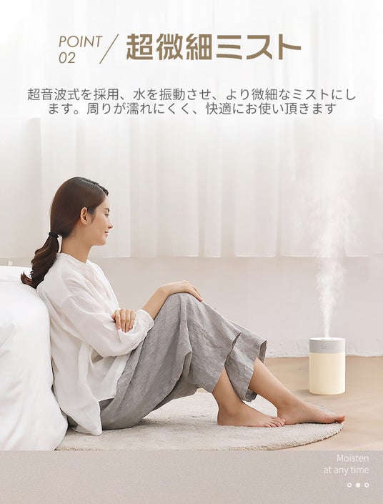 【 微細ミストの高分子超音波技術】肌・喉に優しく、周囲を濡らさない