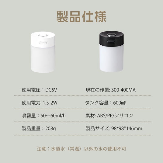【 大容量600mlタンク × 最長18時間連続運転】夜間も給水不要の安心設計
